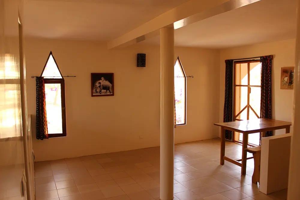 Composé d'une piece avec vue sur le jardin tropical. Un salon, 1 lit double avec moustiquaire et ventilateur, une salle de douche et toilette