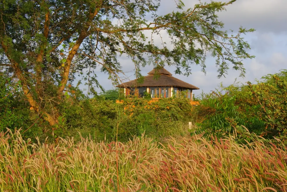 Loft panoramique de 50 m² composé d’un espace nuit avec lit double et moustiquaire, d’un salon, d’une salle de douche avec toilettes, offrant une vue dégagée sur la lagune, la savane, les baobabs et la colline de Guéréo