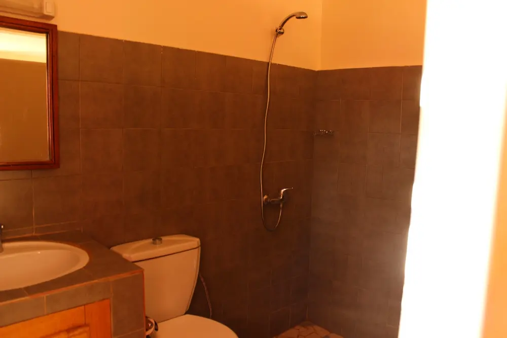 Composé de 1 pièce : Lit double avec moustiquaire et ventilateur, un coin salon, une salle de douche et toilette